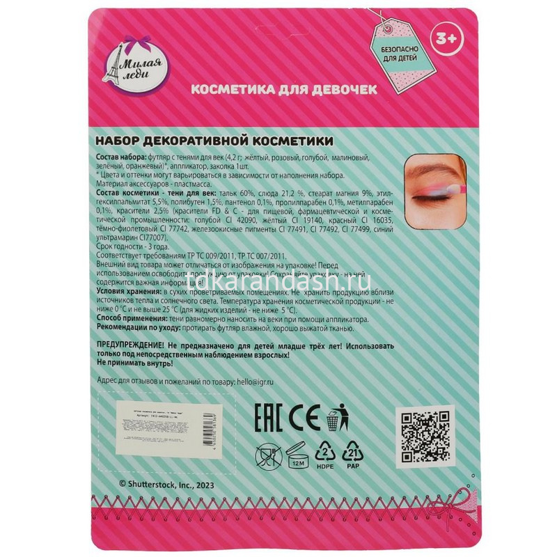 Девочки в любом возрасте хотят быть красивыми. Специально для юных модниц был разработан этот набор, состоящий из теней для век в красивом футляре и стильной заколки для волос. Маленькая принцесса обязательно оценит красочные цвета и модную упаковку. Развивайте чувство стиля и вкуса, учите девочку создавать свой неповторимый образ вместе с косметикой ТМ "Милая леди".