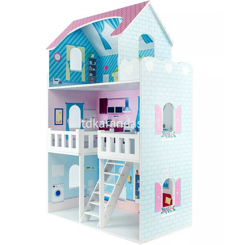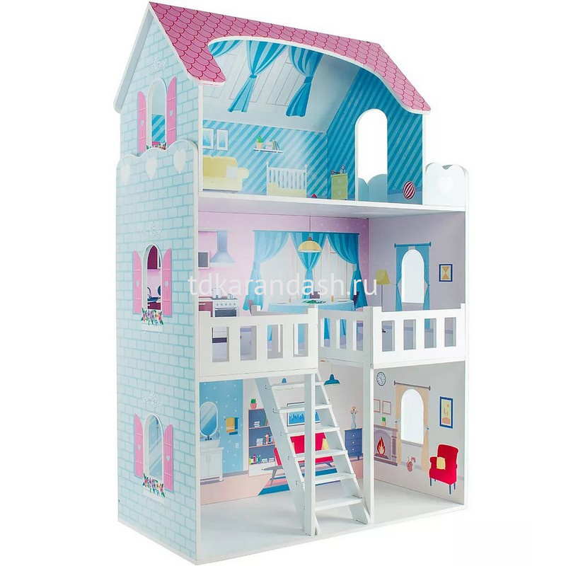 В домике 2 этажа. Задняя стенка дома глухая, а лицевая часть полностью открыта, позволяя ребёнку играть в нём.