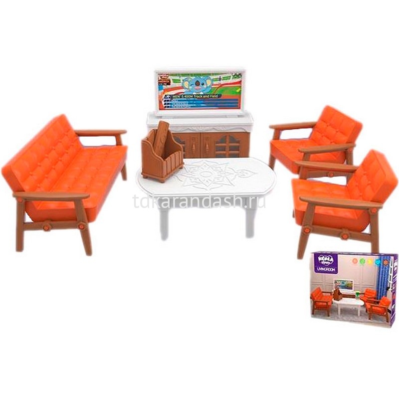 При помощи набора ваша дочурка может обустроить в кукольном домике замечательную гостиную для своих любимых кукол. Предметы мебели выполнены в приятных тонах. Набор состоит из дивана с двумя стульями, стола, стойки с телевизором и аксессуаров. С этим набором, ваш ребенок может наглядно увидеть каким образом должны быть устроены разные помещения, формируя нормальное понимание окружающего мира. Все элементы столовой выполнены из качественных и безопасных материалов.