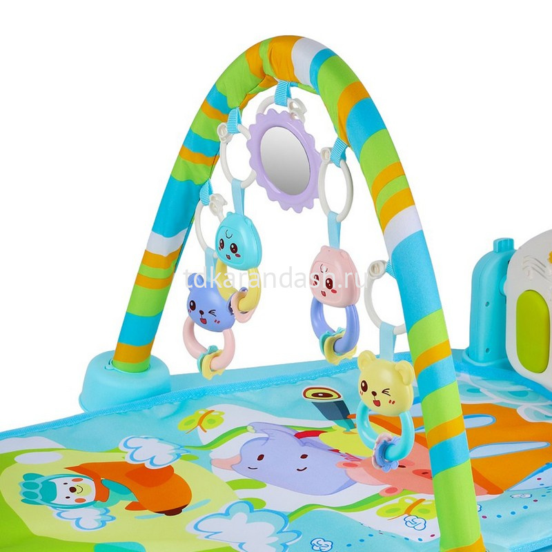 На дуге, раскрашенной в яркие цвета, висят 4 пластиковые погремушки и безопасное зеркало, которые надолго увлекут малыша.