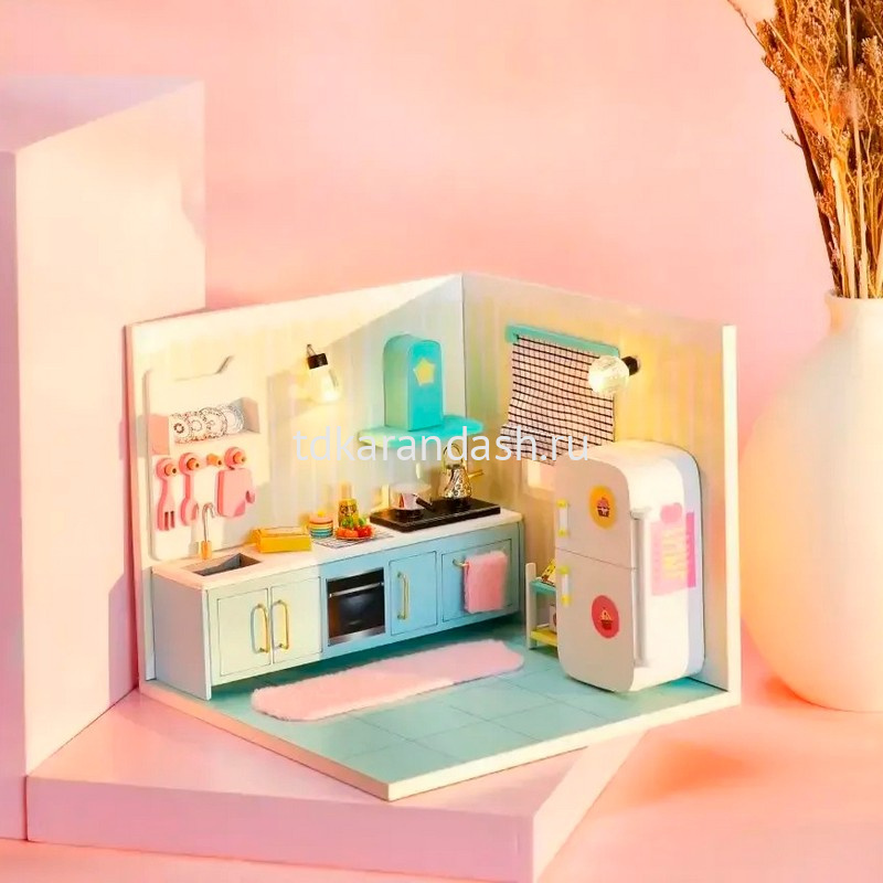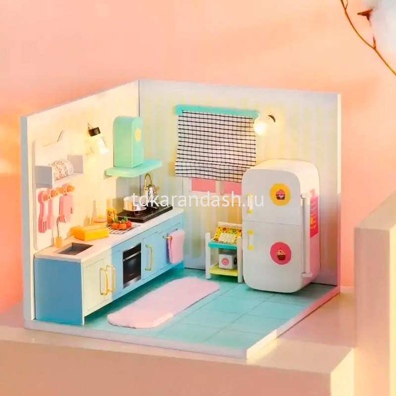 Интерьерный конструктор — это готовый набор для творчества, внутри которого Вы найдете все необходимое, чтобы воссоздать собственными руками кукольный интерьер в миниатюре, используя клей и ножницы. А лампы-светильники придадут мини-комнате особую атмосферу волшебства. Все детали выполнены из безопасных материалов и необыкновенно реалистичны. Подсветка, которая идет в комплекте, придаст непередаваемую атмосферу вашему кукольному жилищу. Работает все от двух батареек. В комплекте идет множество деталей для создания стильной кухни. В процессе вы воссоздадите все детали интерьера: мебель, занавески, посуду, бытовую технику, тумбочки, лампочки и аксессуары. В этом вам поможет подробная инструкция, ножницы и прозрачный клей, которые идут вместе с боксом. Специальный купол защитит готовое изделие от пыли и грязи, что надолго сохранит привлекательный вид конструктора. Размер упаковки 18х15х8см.