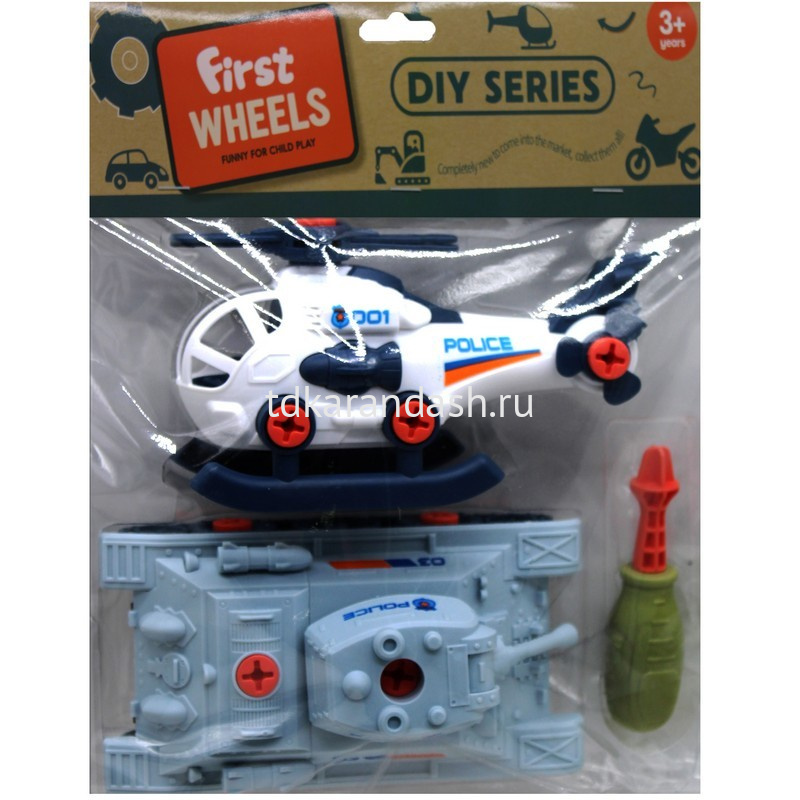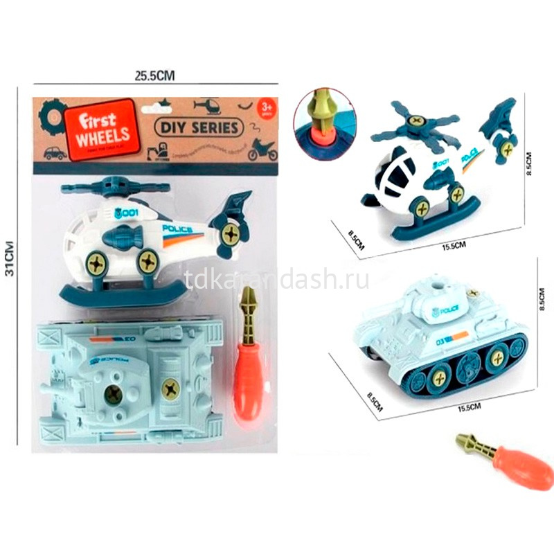 В набор игрового конструктора входит модель полицейского вертолета и модель танка. Элементы конструктора выполнены из прочного пластика и окрашены в яркие цвета. Детали легко и плотно соединяются между собой. Фигурки можно разбирать и собирать, выкручивая пластиковые болты. Пластиковая отвёртка в комплекте.
