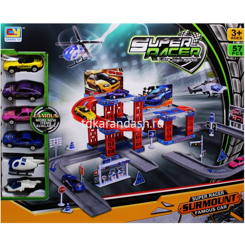 На парковке есть заправка, лифт, авторемонтная мастерская, вертолетная площадка и лифт для перевозки автомобилей на один из этажей. В комплект также входит набор дорожных знаков.