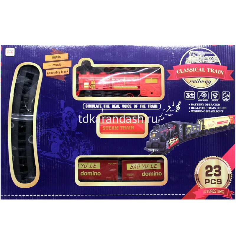Роскошная игрушечная железная дорога с поездом, со светом и звуком. Аксессуары вагоны, игрушка поезд в стиле ретро, игрушечный поезд с эффектной подсветкой, звуками гудка и стука колес. Вагончики и поезд соединяются между собой, рельсы легко собираются, конструктор удобно хранить в компактной коробке.