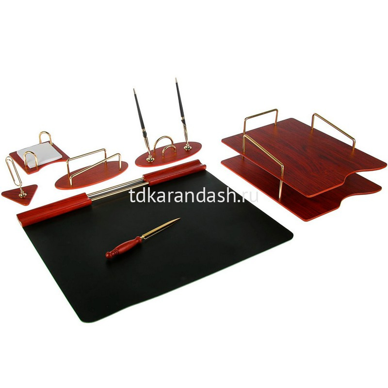 Набор состоит из 7 предметов: Гибкая подкладка для письма с деревянным декором, 2-х ярусный лоток для бумаг, подставка с 1-ой шариковой ручкой, канцелярский нож для вскрытия корреспонденции, подставка для бумажного блока с бумагой, стаканчик для письменных принадлежностей, подставка для скрепок и шариковых ручек.