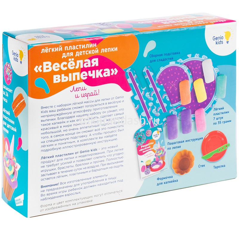 Вместе с набором ребенок сможет погрузиться в веселую и непринужденную атмосферу приготовления выпечки. С помощью подробной иллюстрированной инструкции сможет слепить пончики, капкейки, аппетитный тортик и многое другое, что только придет в голову. Легкий пластилин, входящий в набор, обладает массой удивительных свойств, благодаря которым процесс лепки будет простым и увлекательным. Особенности: