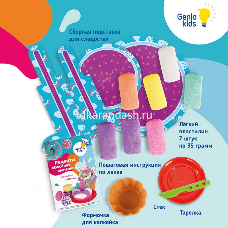 - изготовлен из современных и безопасных материалов. В наборе: легкий пластилин в обертке по 35 грамм - 7 шт., пластиковая тарелка - 1 шт., тарелка - 1 шт., стек-нож - 1 шт., заготовка для создания двухъярусной подставки - 1шт., инструкция - 1 шт.