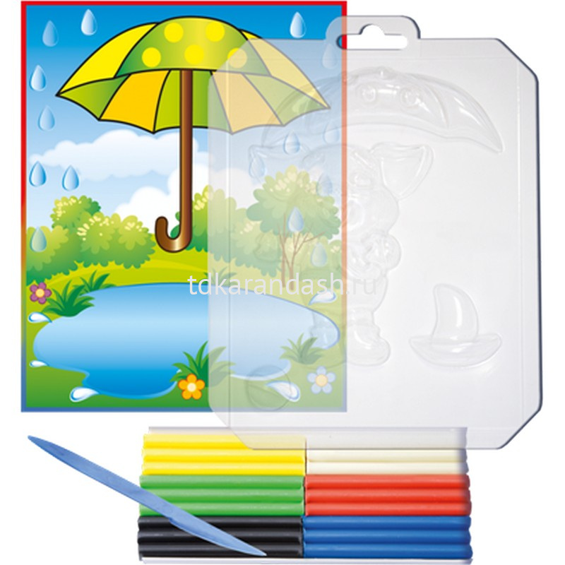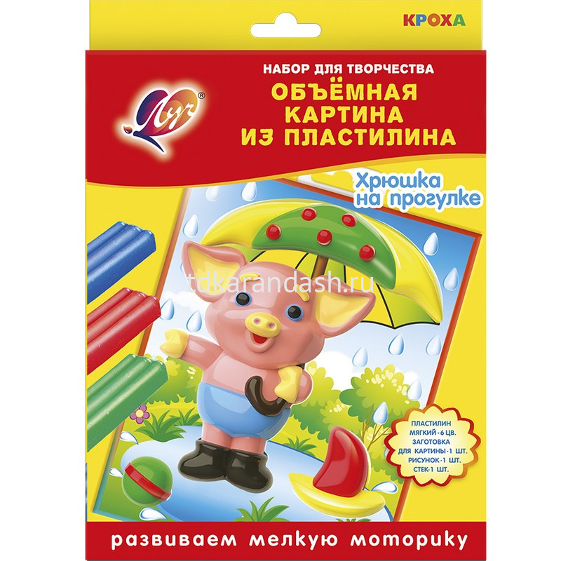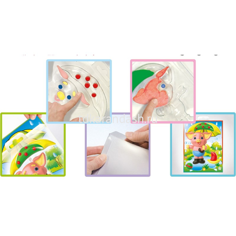 В состав набора входит мягкий восковой пластилин 6 цветов, который не требует предварительного разминания и идеально подходит для детских пальчиков, объёмная пластиковая заготовка с рельефом, цветной фоновый рисунок, стек. Для того, чтобы сделать картину, необходимо разместить предварительно слепленные из пластилина глазки в специальные углубления на картине, заполнить изнутри рельеф рисунка пластилином, вставить красочный фон, загнуть края. И объемная картина готова. Она послужит оформлением творческого уголка в детской или подарком для бабушки, дедушки, мамы, папы или любимого воспитателя.