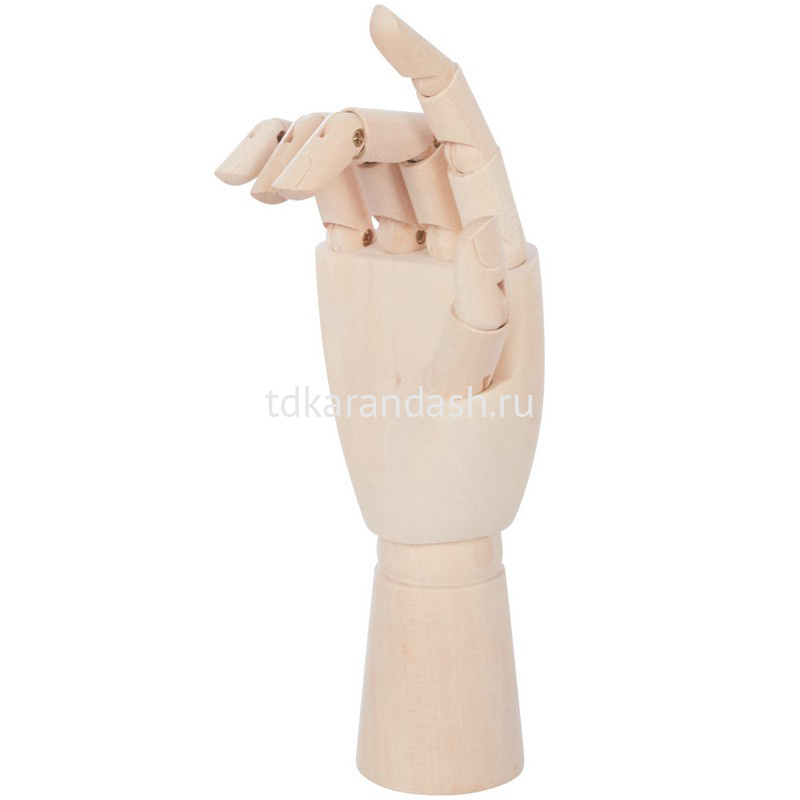 Манекен изготовлен из дерева, представляет из себя модель женской правой руки, способной сгибаться в местах сгиба фаланг пальцев и в области запястья. Соединения предоставляют возможность зафиксировать модель в необходимом положении. Манекен является отличной альтернативой живой натуре, поскольку не может случайно это положение поменять. Высота - 18см. Упакован в коробку.