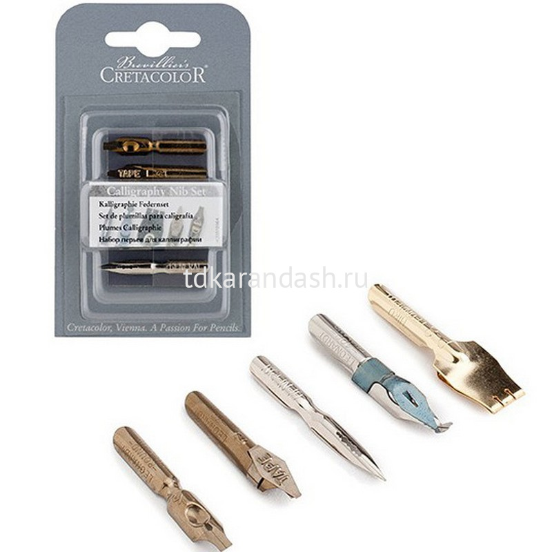 В наборе - 5 перьев, деревянный держатель покрытый лаком (с удобным рычажком, который фиксирует перо) и традиционный стеклянный флакон с черными влагостойкими чернилами Cretacolor.