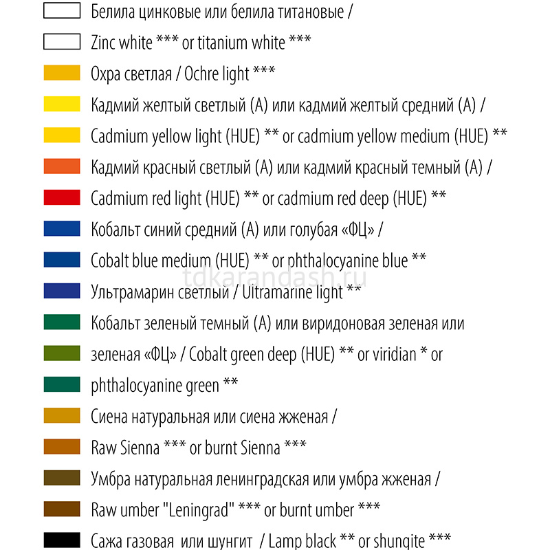 В палитре масляных красок "Ладога" дорогие неорганические пигменты были заменены на органические с помощью тщательно подобранных соотношений компонентов, при этом аналоги полностью соответствуют оригинальным цветам. Для удобства пользователя цвета, которые созданы с заменой пигментов, обозначены на этикетке буквой "А" (аналог)