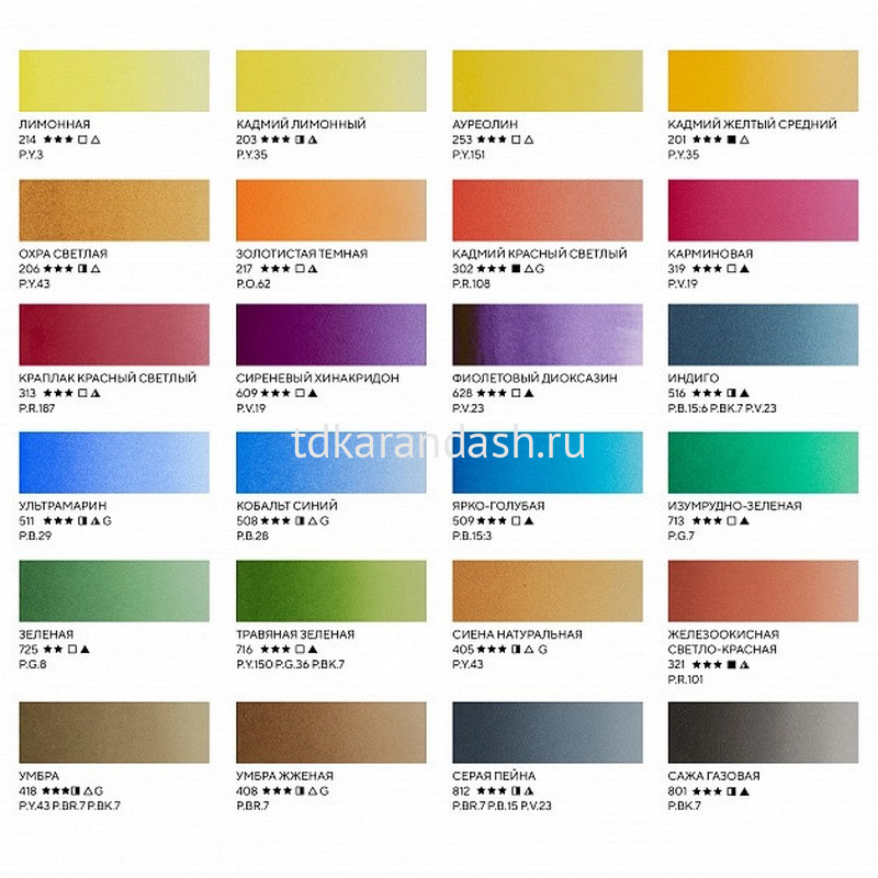 Цвета в наборе: лимонная, кадмий лимонный, ауреолин, кадмий желтый средний, охра светлая, золотистая тёмная, кадмий красный светлый, карминовая, краплак красный светлый, сиреневый хинакридон, фиолетовый диоксазин, индиго, ультрамарин, кобальт синий, ярко-голубая, изумрудно-зелёная, зелёная, травяная зелёная, сиена натуральная, железоокисная светло-красная, умбра, умбра жжёная, серая пейна, сажа газовая.