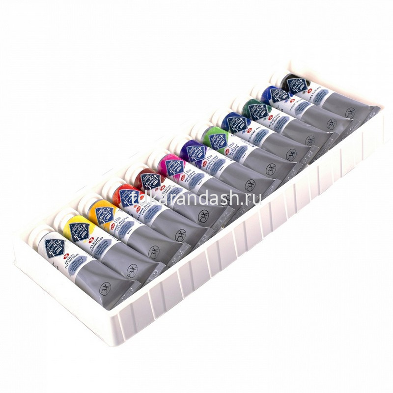 Цвета в наборе: 101 Белила титановые P.W.6, 203 Кадмий лимонный P.Y.35, 201 Кадмий желтый средний P.Y.35, 302 Кадмий красный светлый P.R.108, 317 Краплак красный (А) P.R.264, 368 Неоновая розовая Пигмент флуоресцентный карминовый P.V.1, 628 Фиолетовый диоксазин P.V.23, 745 Майская зелёная P.Y.35 P.G.36, 500 Голубая "ФЦ" P.B.15, 713 Изумруднo-зеленая P.G.7, 511 Ультрамарин P.B.29, 801 Сажа газовая P.Bk.7.