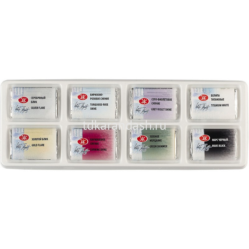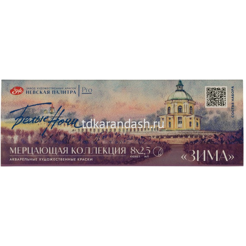 Цветовая гамма набора состоит из 6 оттенков мерцающих акварелей с различным зерном мерцающих частиц, дополненных белым и черным оттенками основной палитры акварели "Белые Ночи".