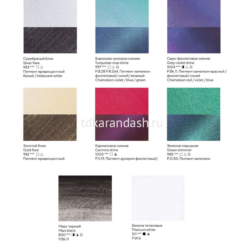 Состав набора: 983 Серебряный блик | 982 Золотой блик | 985 Зеленое мерцание | 997 Бирюзово-розовое сияние | 1004 Серо-фиолетовое сияние | 1000 Карминовое сияние | 101 Белила титановые | 800 Марс черный |