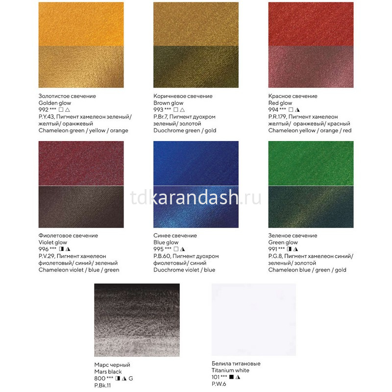 Состав набора: 996 Фиолетовое свечение | 993 Коричневое свечение | 994 Красное свечение | 991 Зеленое свечение | 992 Золотистое свечение | 995 Синее свечение | 101 Белила титановые | 800 Марс черный |