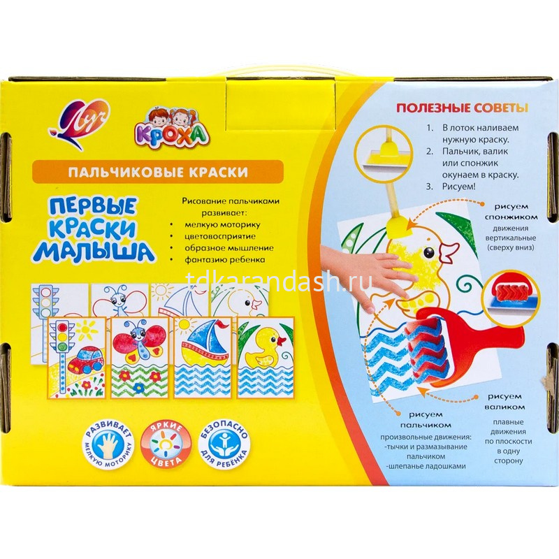 Легкость в уходе. Пальчиковые краски "Кроха" легко смываются водой, и родители могут не беспокоиться о чистоте одежды или грязных поверхностях.