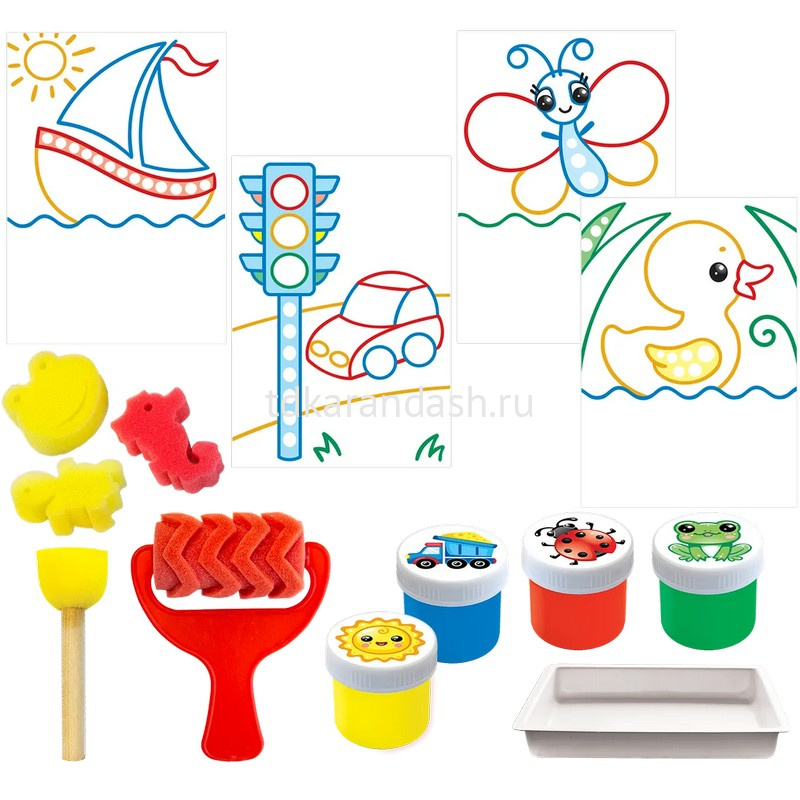 Состав набора: 4 герметичные баночки с краской ёмкостью 40 мл. (жёлтый,синий, красный, зелёный), роллер "Волна" - 1 шт., спонжик на деревянной ручке, лоток для рисования, раскраски - 4 шт. В подарок - спонжики в ассортименте - 3 шт.