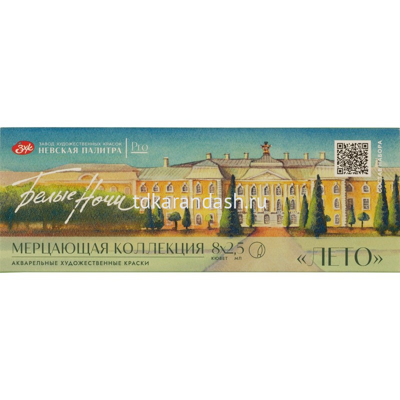 Цветовая гамма набора состоит из 6 ярких оттенков мерцающих акварелей серии "Мерцание", дополненных белым и черным оттенками основной палитры акварели "Белые Ночи".