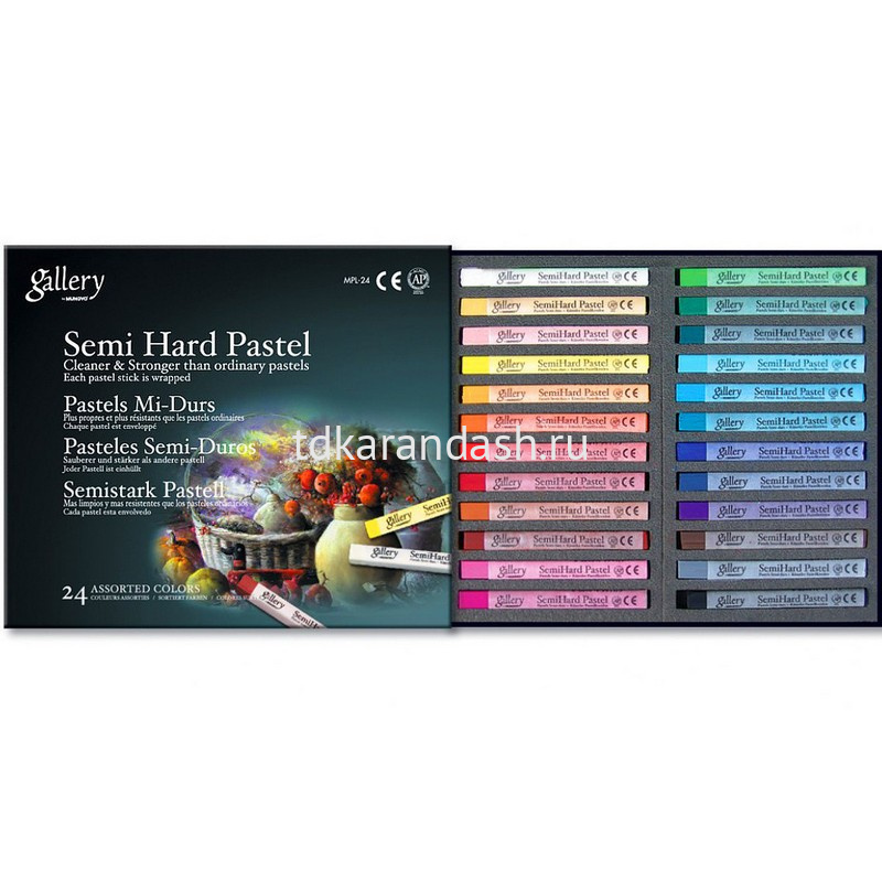 В набор входят 24 пастельных мелка "Artists' Semi-Hard" серии GALLERY от компании "Mungyo" (Корея). Это художественные полутвердые пастельные мелки, квадратные, в бумажных манжетах. Изготовлены из проверенного безопасного, очень качественного сырья. Пастель отличается прекрасным балансом "твёрдость-мягкость": она достаточно мягкая, чтобы хорошо ложиться на бумагу, растушевываться и смешиваться, но достаточно твердая, чтобы не образовывать крошки и пыль, загрязняющие работу. Рамер мелка - ок. 8х8мм в поперечном сечении, длина - ок. 82мм.