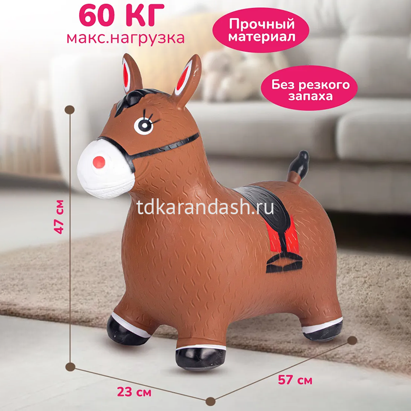 Максимальная нагрузка до 60 кг. Благодаря удобному хвату (за уши или рога) ребёнок легко удержится на прыгуне во время игры. Для детей от 1 года. Размер: 57х23х50см. Материал: PVC.