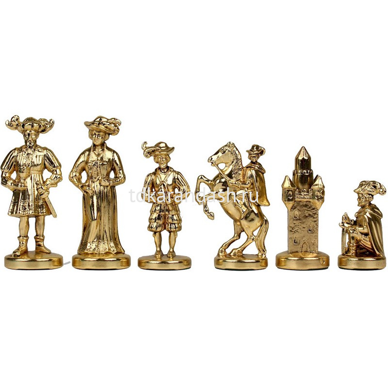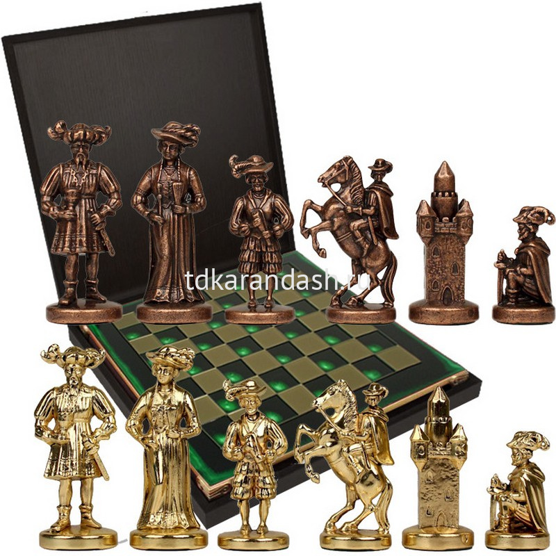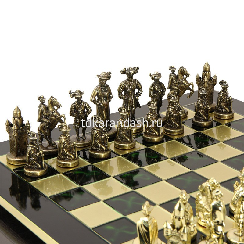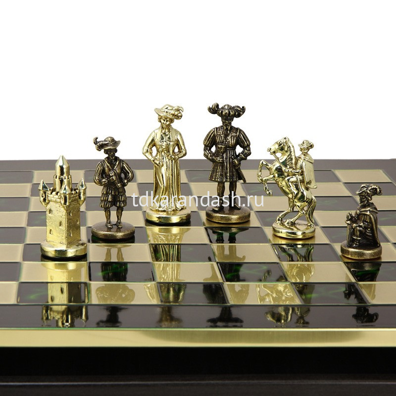 В этом наборе шахматная доска – зеленая; фигуры цвета золото и бронза.