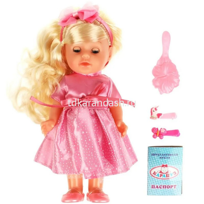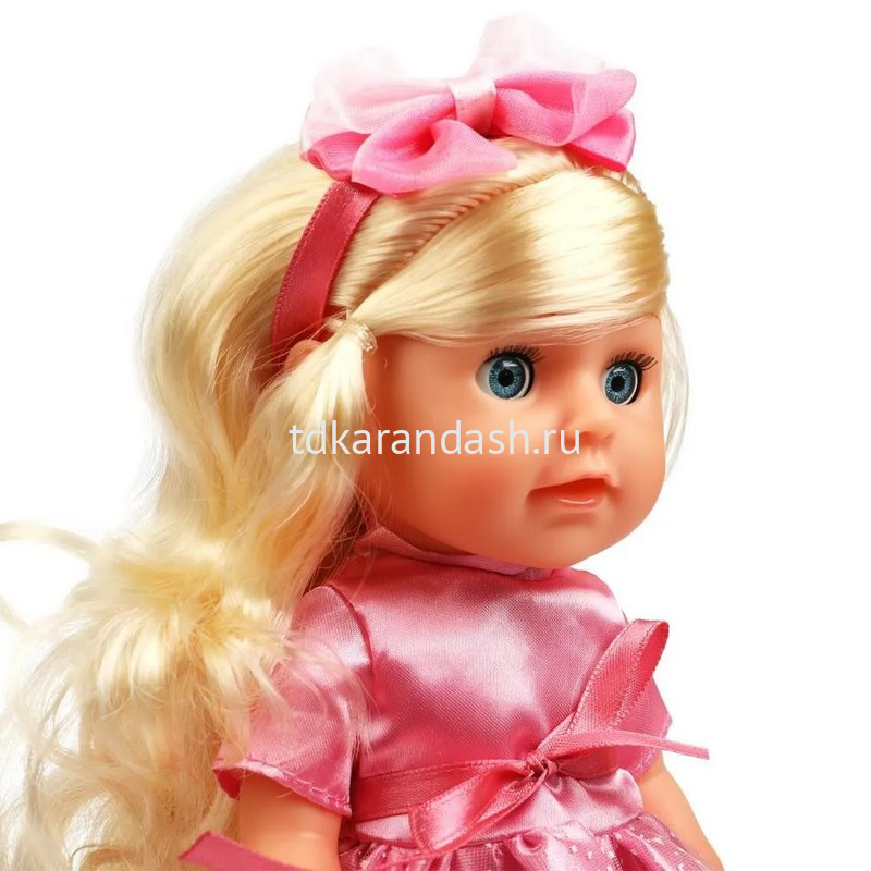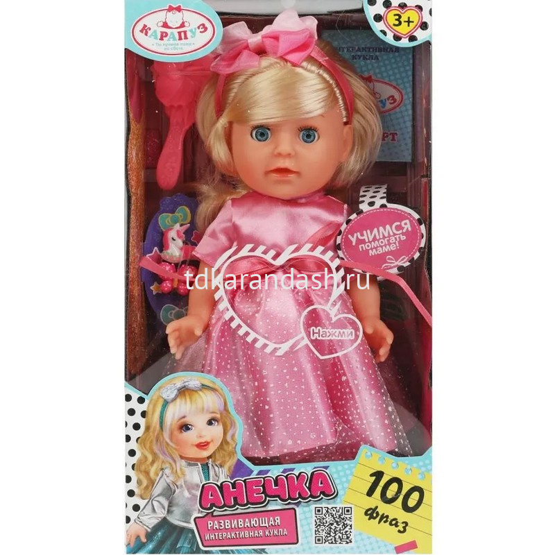 Анечка одета в нарядное розовое платье. Одежда легко снимается и надевается. У куклы длинные красивые волосы. Хозяйка куколки легко сможет сделать Анечке причёску по своему желанию, для этого в наборе имеется расчёска и заколки.