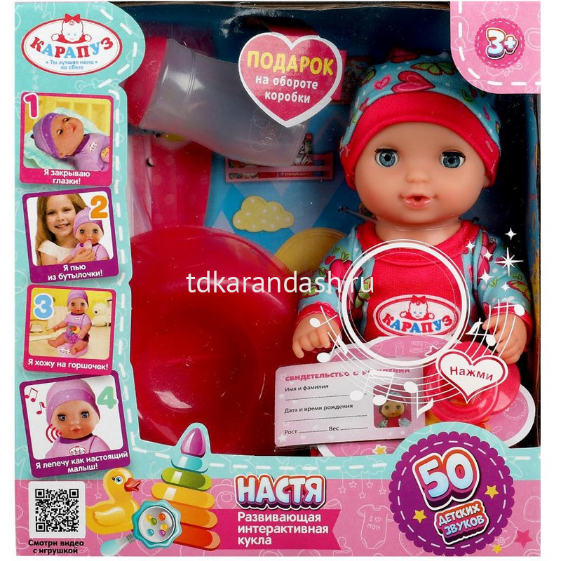 Милый пупс Настя с детально проработанным личиком обязательно понравится вашей малышке. Кукла одета в яркий костюмчик с интересным принтом и шапочку в тон. Одежда легко надевается и снимается. Для более интересной игры в комплекте с пупсом идут разнообразные аксессуары.