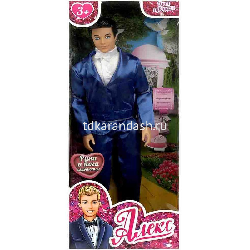 Стильный Алекс, друг Софии, одет в белоснежную рубашку с галстуком-бабочкой, пиджак и брюки насыщенного синего цвета. Одежду легко снять и надеть. С такой модной куклой девочке будет интересно и весело играть: благодаря тому, что руки и ноги куклы подвижны, им можно придать любое положение. Детально проработанный дизайн игрушки вдохновит девочку на новые игровые сюжеты.