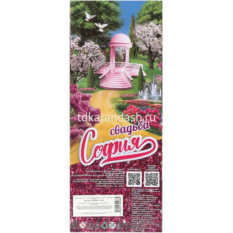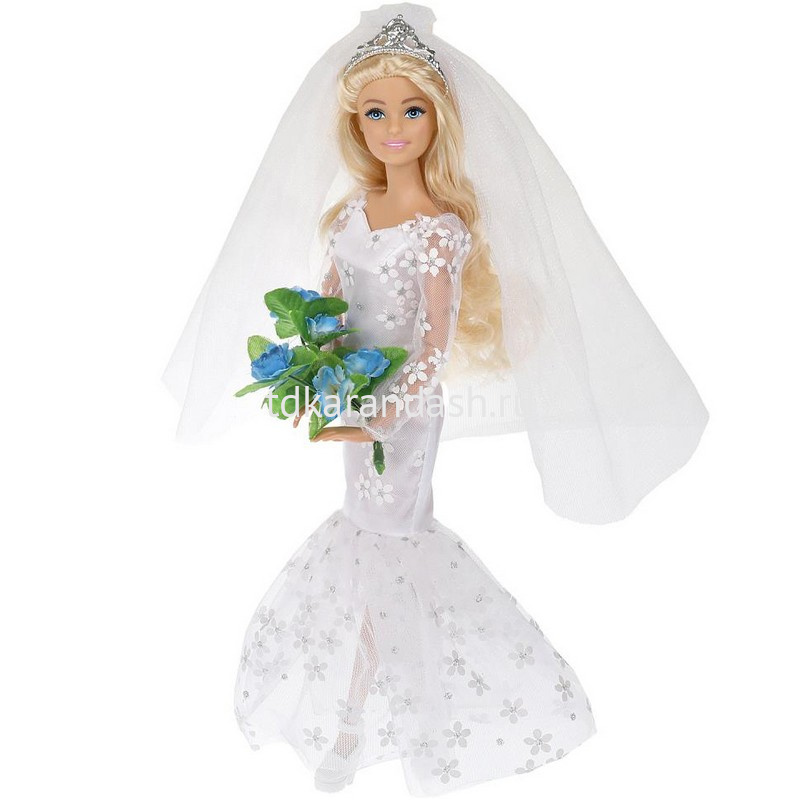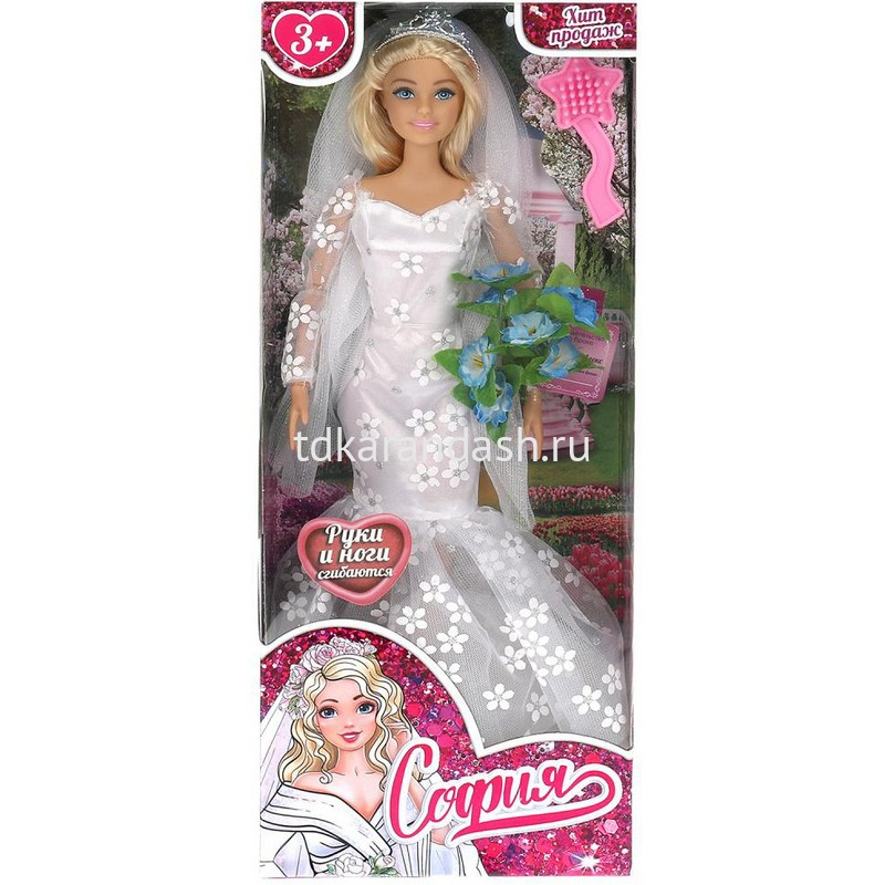Прекрасная невеста София одета в изящное свадебное платье силуэта русалка. Образ дополняют модные крупные серьги, колье, диадема и нежная фата. Одежду и аксессуары легко снять и надеть. С такой модной куклой девочке будет интересно и весело играть: благодаря тому, что руки и ноги куклы подвижны, им можно придать любое положение. У Софии длинные красивые волосы, которые хозяйка куклы сможет заплетать в разные причёски. Детально проработанный дизайн игрушки вдохновит девочку на новые игровые сюжеты.
