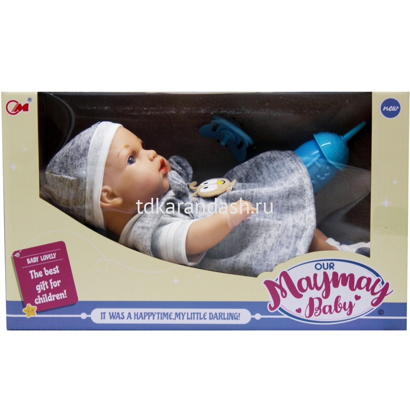 У крохи твёрдое тельце, ручки, ножки и голова подвижные, реснички объёмные. Малыш одет в модный костюмчик. На голове у него милая текстильная шапочка.