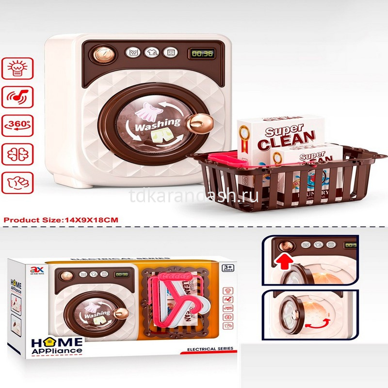 КАК ИГРАТЬ? Установите батарейки в стиральную машинку. Выберите один из трех режимов на панели управления, каждый из них работает в своем ритме и имеет свою скорость вращения барабана. Активируйте игрушку, нажав на кнопку "Старт".