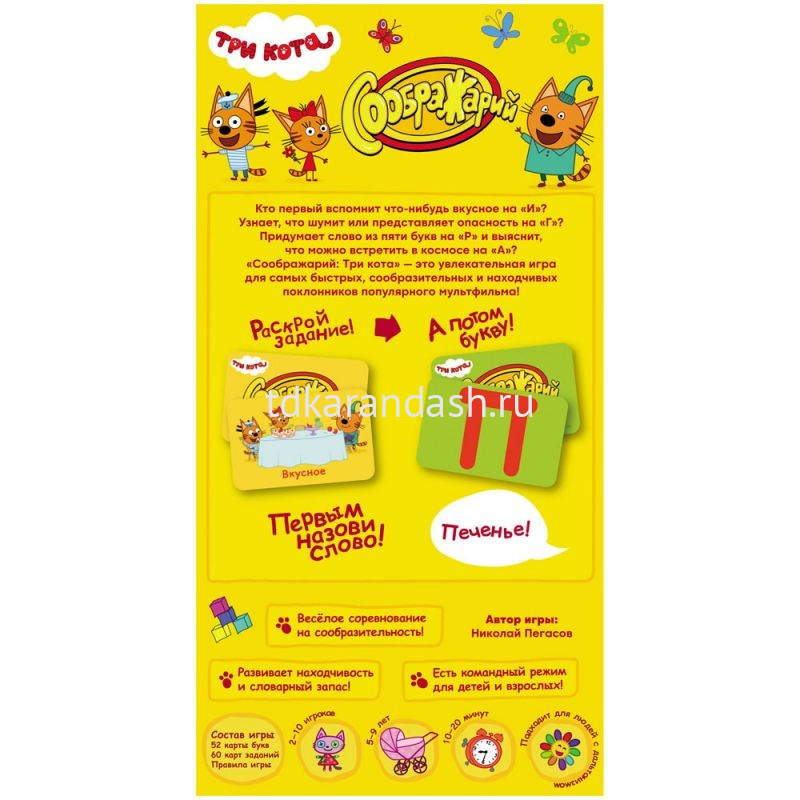 “Соображарий: Три кота” – это весёлая и занимательная игра для компании детей, которые, впрочем, не будут против, если к игре присоединятся и их родители. Придётся как можно быстрее вспоминать различные слова и называть их, да так, чтобы они подходили под определённые условия. Эта настолка придётся по вкусу не только поклонникам одноимённого мультфильма, но и всем-всем-всем!