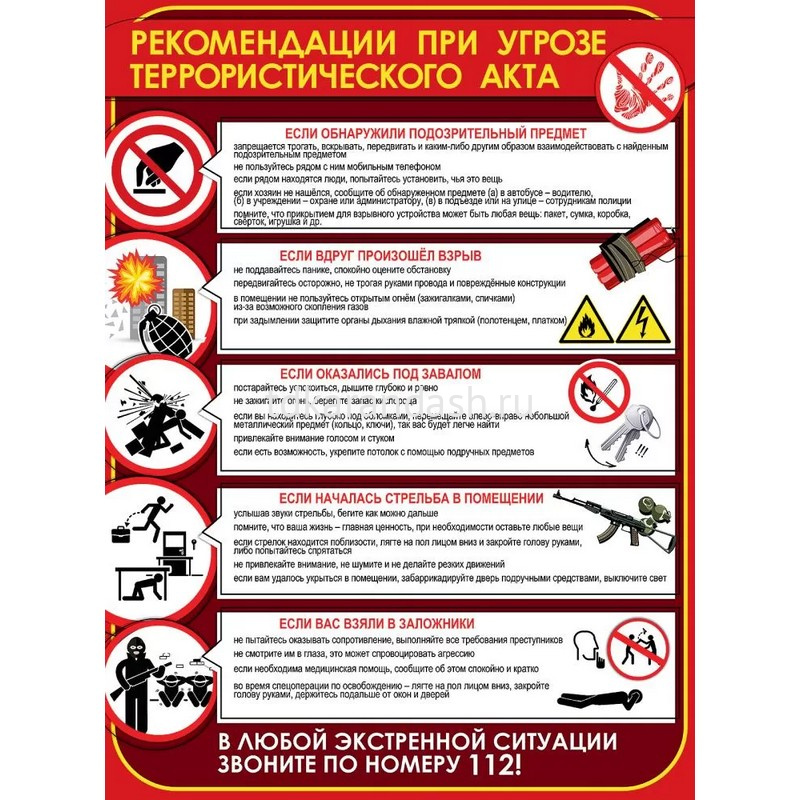 Данный плакат как никогда актуален в наше время. Постер поможет школьникам вести себя правильно и без паники в случае опасности. Этот плакат можно использовать для оформления уголка безопасности как в школе, так и в офисе, детском саду. Каждый должен думать о своей безлопасности и безопасности окружающих!