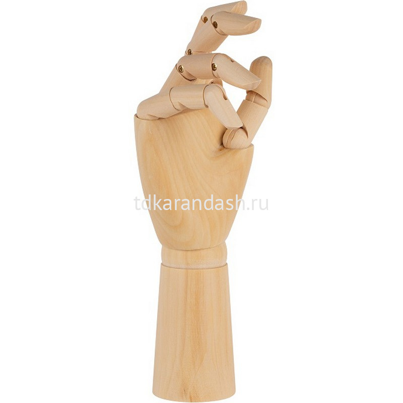 Манекен изготовлен из дерева, представляет из себя модель женской правой руки, способной сгибаться в местах сгиба фаланг пальцев и в области запястья. Соединения предоставляют возможность зафиксировать модель в необходимом положении. Манекен является отличной альтернативой живой натуре, поскольку не может случайно это положение поменять. Высота - 18см. Упакован в коробку.