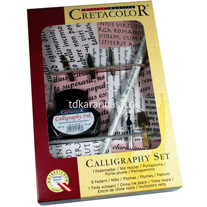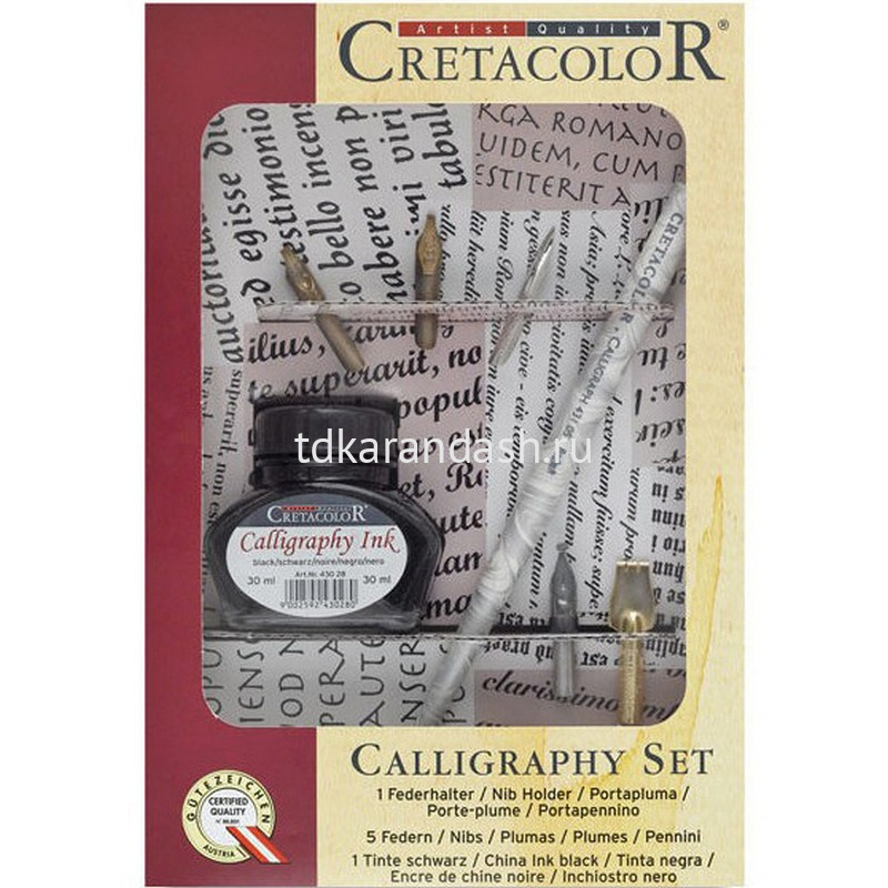 В наборе - 5 перьев, деревянный держатель покрытый лаком (с удобным рычажком, который фиксирует перо) и традиционный стеклянный флакон с черными влагостойкими чернилами Cretacolor.
