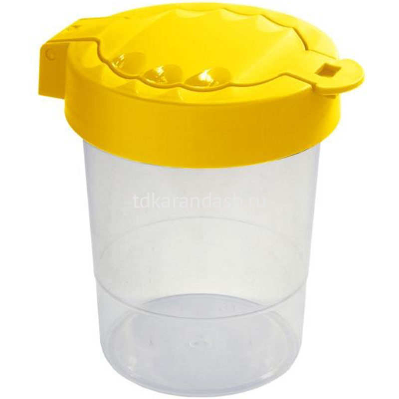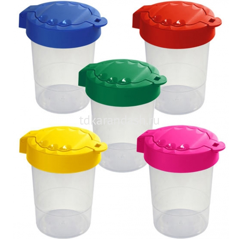 Крышка стакана выполнена в 5 ярких цветах (ассорти): зелёный, жёлтый, оранжевый, красный, синий. На крышке 5 продольных желобков для кисточек.