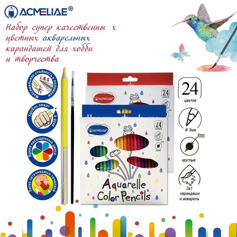 Мягкий грифель легко ложится на бумагу. Яркие красивые цвета хорошо смешиваются и размываются водой, создавая реалистичный эффект акварели.