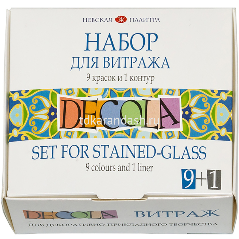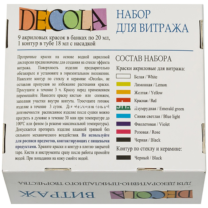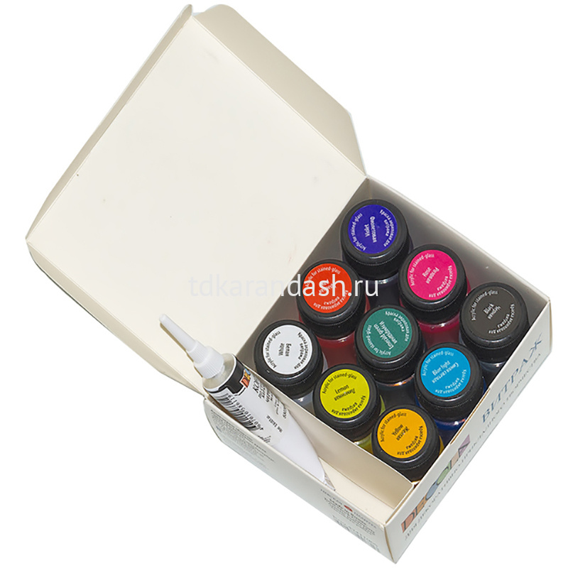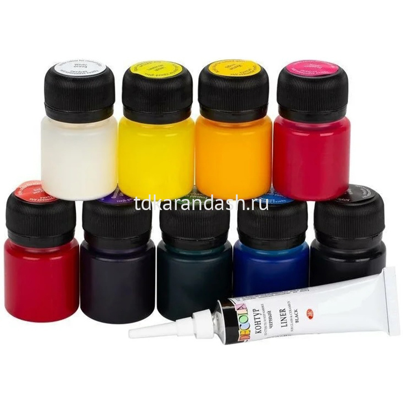 В наборе девять баночек по 20 мл с красками разного цвета и контур.