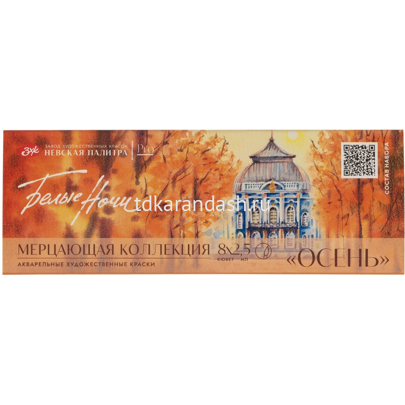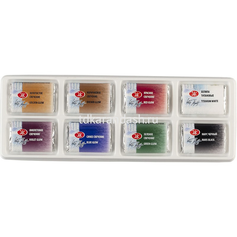 Цветовая гамма набора состоит из 6 насыщенных оттенков мерцающих акварелей серии "Свечение", дополненных белым и черным оттенками основной палитры акварели "Белые Ночи".