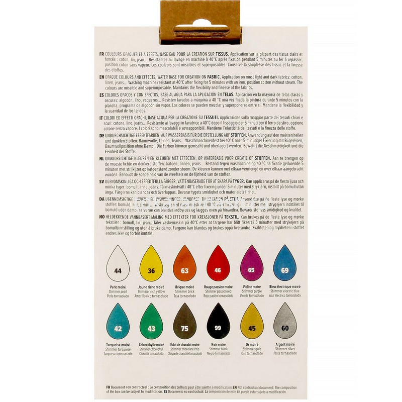 Фиксация: два варианта 1) Гладить в течение 5 минут в положении "хлопок" без пара, с изнаночной стороны ткани. 2) В домашней духовке на 5 минут при температуре 150°C : после фиксации декорированные ткани устойчивы к машинной стирке при температуре 40°C или ручной стирке. Сухая чистка не рекомендуется.