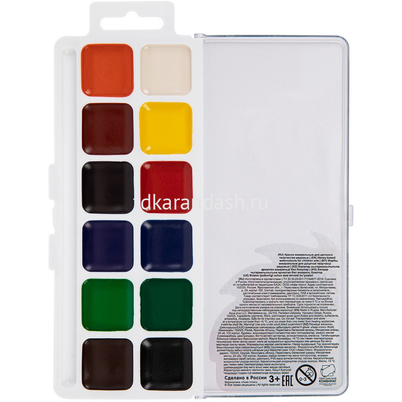 Акварель выпускается в классическом пластиковом пенале компактного размера с прозрачной крышкой. Удобный замок легко открывается и закрывается. Пенал достаточно прочный, выдерживает многократные падения. Крышку можно использовать как палитру для смешивания красок, есть отделение для кисточки, сама кисточка в комплекте не идет.