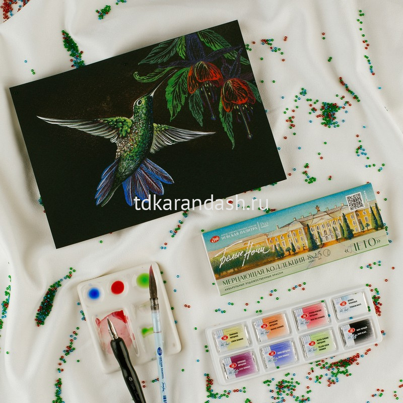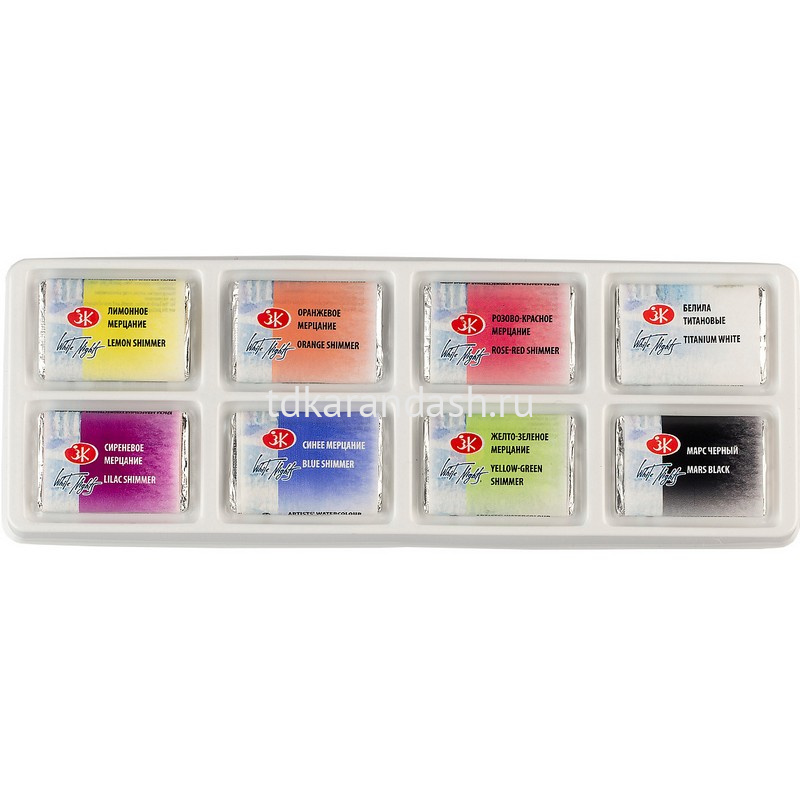 Цветовая гамма набора состоит из 6 ярких оттенков мерцающих акварелей серии "Мерцание", дополненных белым и черным оттенками основной палитры акварели "Белые Ночи".