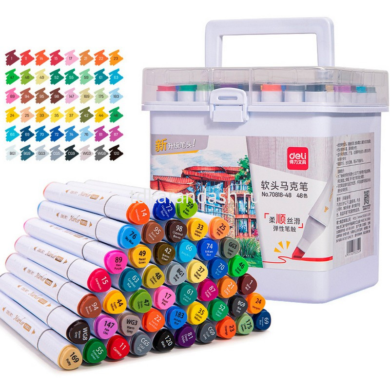 Колпачок соответствует цвету маркера. В наборе 48 цветов.