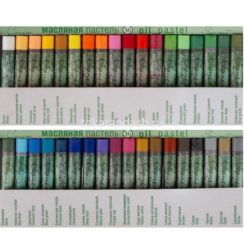 Набор состоит из 24 цветов: белая, желтая телесная, желто-розовая, лимонная, оранжево-желтая, оранжевая, розовая, алая, кармин, желто-зеленая, зеленая средняя, зеленая темная, травяная зеленая, небесно-голубая, синяя, берлинская лазурь, ультрамарин, фиолетовая светлая, охра желтая, сиена натуральная, красно-коричневая, коричневая, серая, черная.