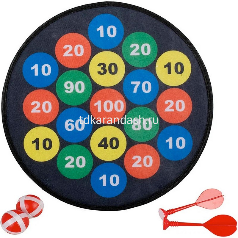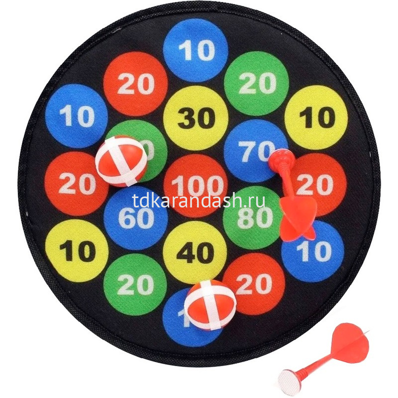 В наборе имеется мишень диаметром 27см, два дротика длиной 9см, а также два шарика диаметром 3,5см. Снаряды на липучках делают игровой процесс безопасным для ребенка. Дартс — популярная по всему миру игра на меткость и точность броска. С задней стороны пришита небольшая петелька для крепления мишени в удобном для играющих месте. Круг разделён на зоны, за попадание в каждую из которых игрок получает определённое количество очков. Увлекательная игра поможет провести время весело и с пользой, а также разнообразить семейный или дружеский досуг.