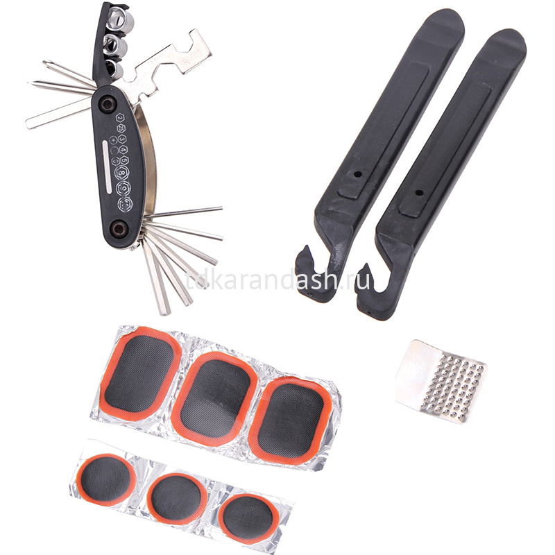 В комплекте: заплатки, монтировки для монтажа покрышек, скребок для зачистки места прокола на камере.